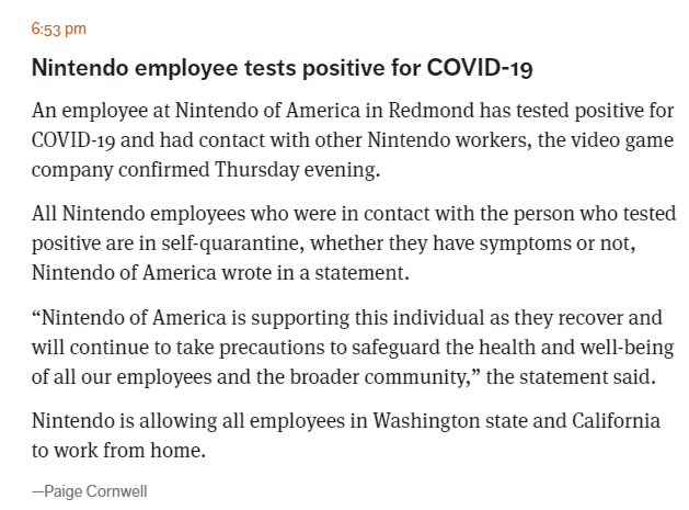 根據(jù)《西雅圖時報》的相關報道,美國任天堂一名員工目前已經(jīng)出現(xiàn)“新冠病毒檢測陽性”的狀況,目前,與這位員工有過接觸的其他人員已經(jīng)開始自我隔離?!段餮艌D時報》報道原文: