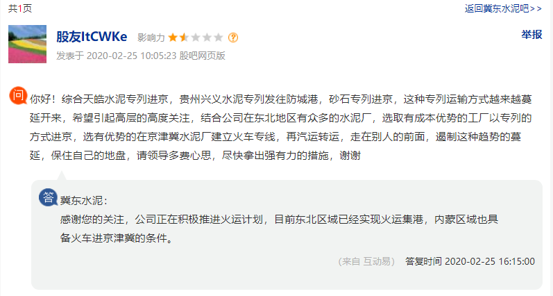 日前有股友在上市公司平臺向冀東水泥提問并建議:稱綜合天皓水泥專列進京,貴州興義水泥專列發(fā)往防城港,砂石專列進京,這種專列運輸方式越來越蔓延開來,希望引起高層的高度關注。