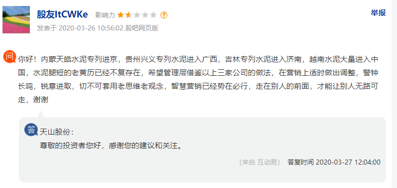 同期有投資者在上市平臺向天山股份董秘提問并建議說:內(nèi)蒙天皓水泥專列進京,貴州興義專列水泥進入廣西,吉林專列水泥進入濟南,越南水泥大量進入中國,水泥腿短的老黃歷已經(jīng)不復存在,希望管理層借鑒以上三家公司的做法,在營銷上適時做出調(diào)整,警鐘長鳴,銳意進取,切不可套用老思維老觀念,智慧營銷已經(jīng)勢在必行,走在別人的前面,才能讓別人無路可走。