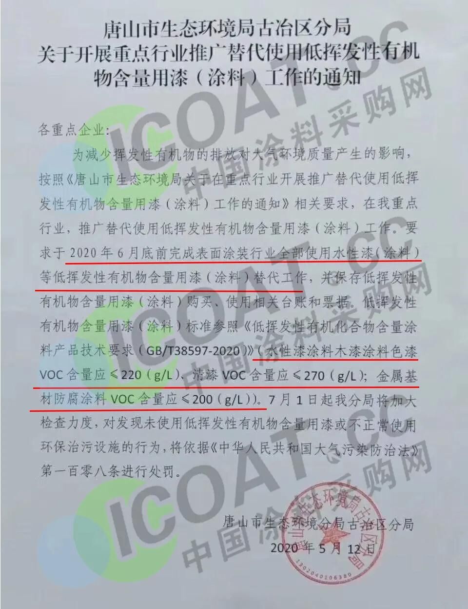 為減少揮發(fā)性有機物的排放對大氣環(huán)境質(zhì)量產(chǎn)生的影響,按照《唐山市生態(tài)環(huán)境局關(guān)于在重點行業(yè)開展推廣替代使用低揮發(fā)性有機物含量用漆(涂料)工作的通知》相關(guān)要求,在我重點行業(yè),推廣替代使用低揮發(fā)性有機物含量用漆(涂料)工作,要求于2020年6月底前完成表面涂裝行業(yè)全部使用水性漆(涂料)等低揮發(fā)性有機物含量用漆(涂料)替代工作,并保存低揮發(fā)性有機物含量用漆(涂料)購買、使用相關(guān)臺賬和票據(jù)。低揮發(fā)性有機物含量用漆(涂料)標(biāo)準(zhǔn)參照《低揮發(fā)性有機化合物含量涂料產(chǎn)品技術(shù)要求(GB/T38597-2020)》(水性漆涂料木漆涂料色漆VOC含量應(yīng)≤220(g/L)、清漆VOC含量應(yīng)≤270(g/L);金屬基材防腐涂料VOC含量應(yīng)≤200(g/L))。 7月1日起我分局將加大檢查力度,對發(fā)現(xiàn)未使用低揮發(fā)性有機物含量用漆或不正常使用環(huán)保治污設(shè)施的行為,將依據(jù)《中華人民共和國大氣污染防治法》第一百零八條進(jìn)行處罰。??違反本法規(guī)定,有下列行為之一的,由縣級以上人民政府生態(tài)環(huán)境主管部門責(zé)令改正,處二萬元以上二十萬元以下的罰款;拒不改正的,責(zé)令停產(chǎn)整治:(一)產(chǎn)生含揮發(fā)性有機物廢氣的生產(chǎn)和服務(wù)活動,未在密閉空間或者設(shè)備中進(jìn)行,未按照規(guī)定安裝、使用污染防治設(shè)施,或者未采取減少廢氣排放措施的;(二)工業(yè)涂裝企業(yè)未使用低揮發(fā)性有機物含量涂料或者未建立、保存臺賬的;(三)石油、化工以及其他生產(chǎn)和使用有機溶劑的企業(yè),未采取措施對管道、設(shè)備進(jìn)行日常維護(hù)、維修,減少物料泄漏或者對泄漏的物料未及時收集處理的;(四)儲油儲氣庫、加油加氣站和油罐車、氣罐車等,未按照國家有關(guān)規(guī)定安裝并正常使用油氣回收裝置的;(五)鋼鐵、建材、有色金屬、石油、化工、制藥、礦產(chǎn)開采等企業(yè),未采取集中收集處理、密閉、圍擋、遮蓋、清掃、灑水等措施,控制、減少粉塵和氣態(tài)污染物排放的;(六)工業(yè)生產(chǎn)、垃圾填埋或者其他活動中產(chǎn)生的可燃性氣體未回收利用,不具備回收利用條件未進(jìn)行防治污染處理,或者可燃性氣體回收利用裝置不能正常作業(yè),未及時修復(fù)或者更新的。