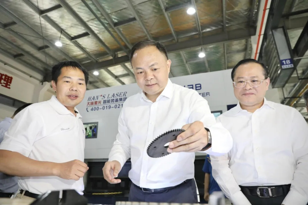 全國(guó)人大代表鄭建新(中)在湖南大族智能裝備有限公司調(diào)研