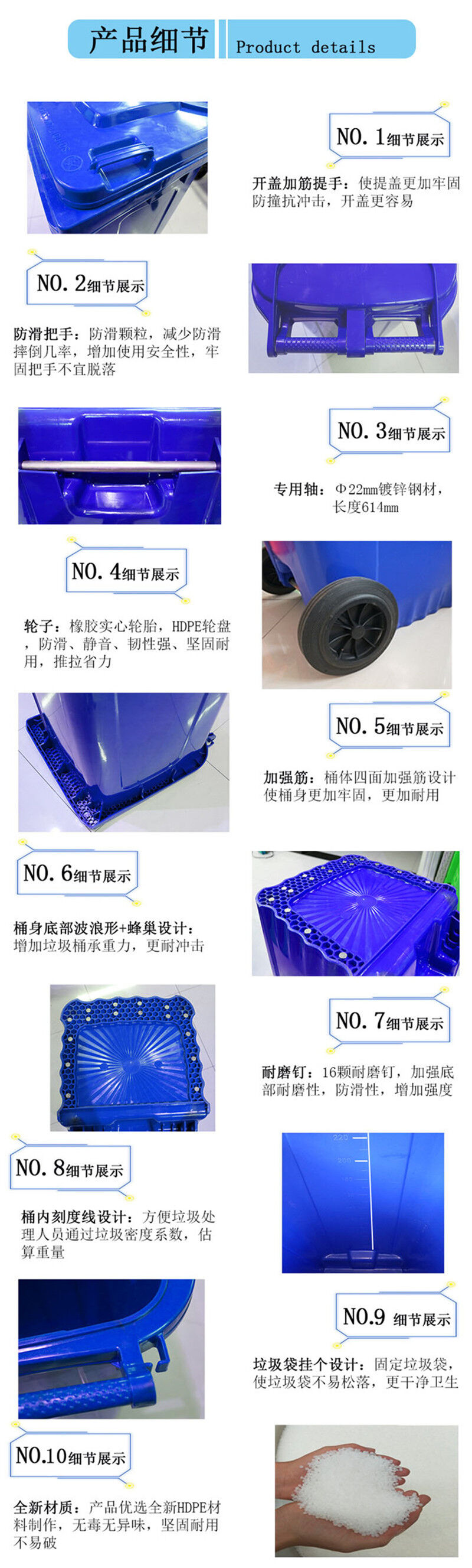 塑料分類垃圾桶經(jīng)久耐用,輕巧靈活,外型美觀,利于環(huán)保,置負載后輪,可跨越梯級或路邊臺階,內(nèi)外表面光潔,便于倒空垃圾與清洗,用于各類公共場所收集廢棄物或原料搬運,大大提高工作效率,計符合人體工程學(xué)。2 特點用優(yōu)質(zhì) 工程材料制造輕便耐用,移動靈活。種色彩,適用于不同的環(huán)境與垃圾分類收集。